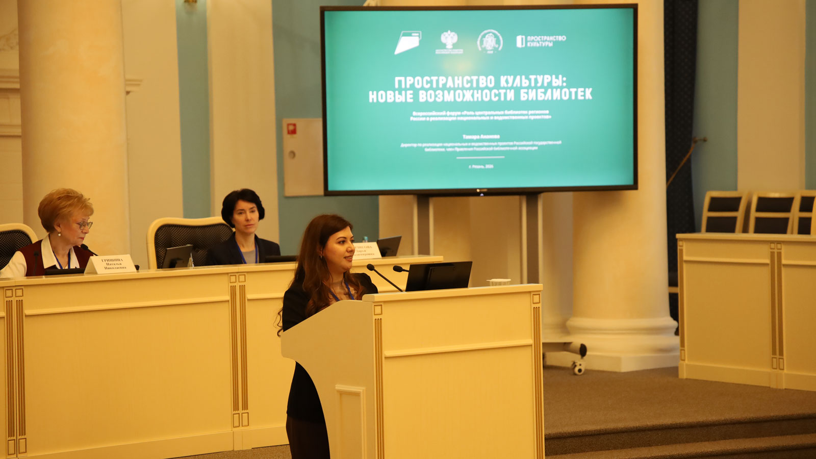 Тамара Ананова, директор по реализации национальных и ведомственных проектов РГБ, зачитала приветственное письмо Вадима Дуды, генерального директора Российской государственной библиотеки, президента Российской библиотечной ассоциации. В своем выступлении она представила этапы реализации национального проекта «Семья» и новые направления работы: создание детских культурно-просветительских центров, выявление лучших практик работы для поощрения библиотек; уделила внимание всероссийским конкурсам «Библиотечная система», «Библиотеки. ПРОдвижение», «Куратор и Точка» (в рамках проекта «Гений места»).